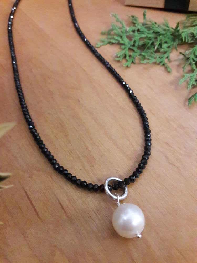 Black Garnet 2mm roundels with heart clasp and jumbo jump ring pendant w/ 9mm white pearl.