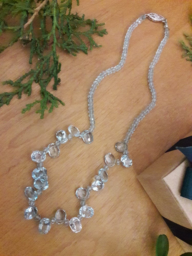 Gorgeous Swiss blue topaz necklace, side-drilled ovals with faceted roundels, 14K white gold filigree clasp. 16" long.