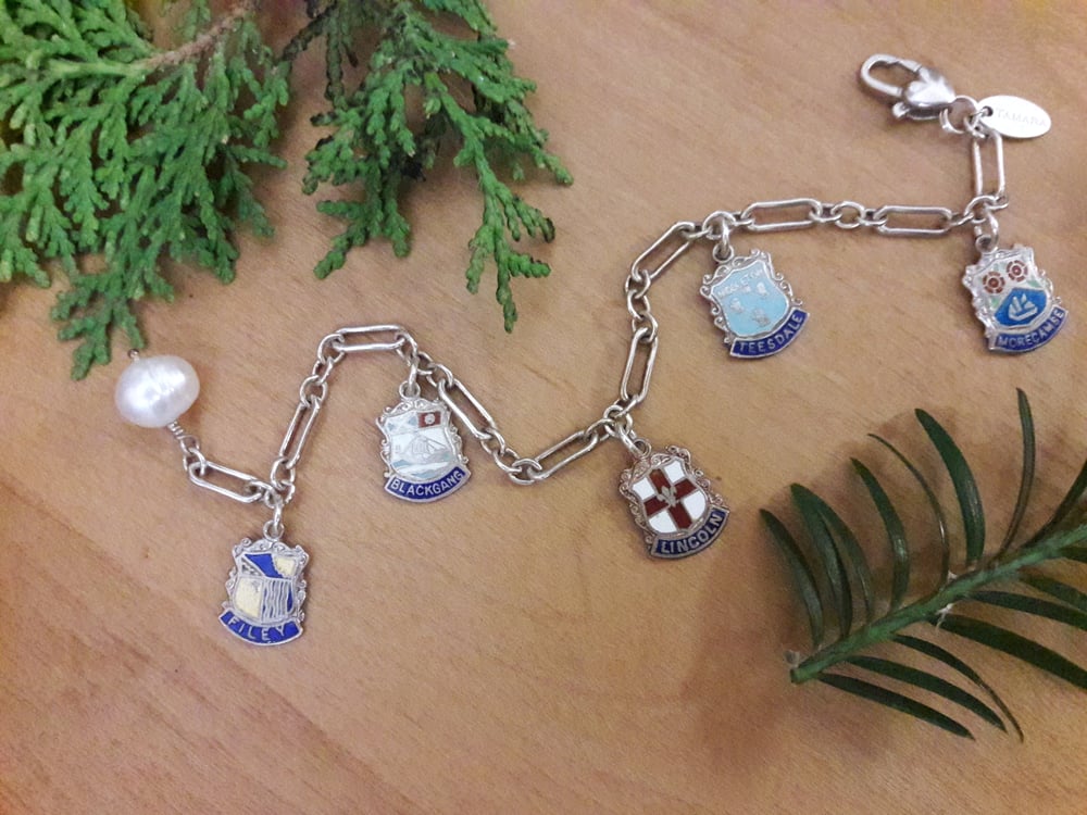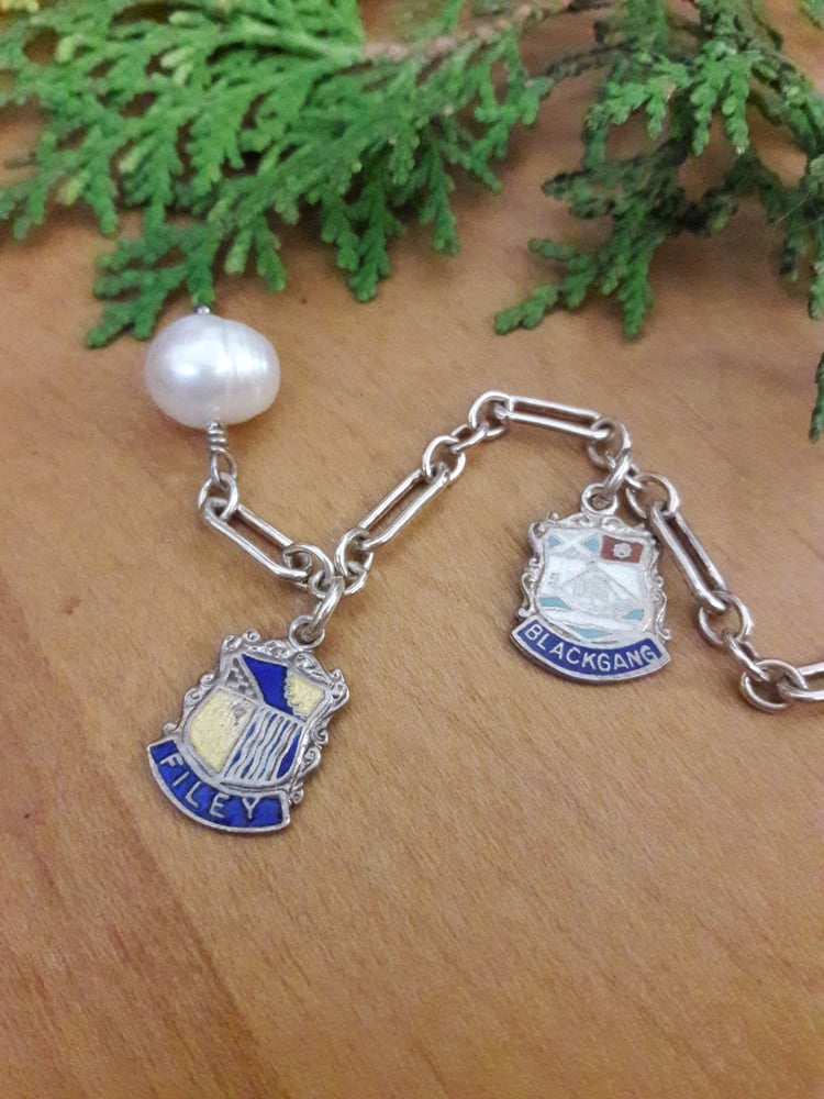 Five antique enameled sterling English city souvenir shields on long and short bracelet, freshwater pearl dangle. 7-1/2" long.