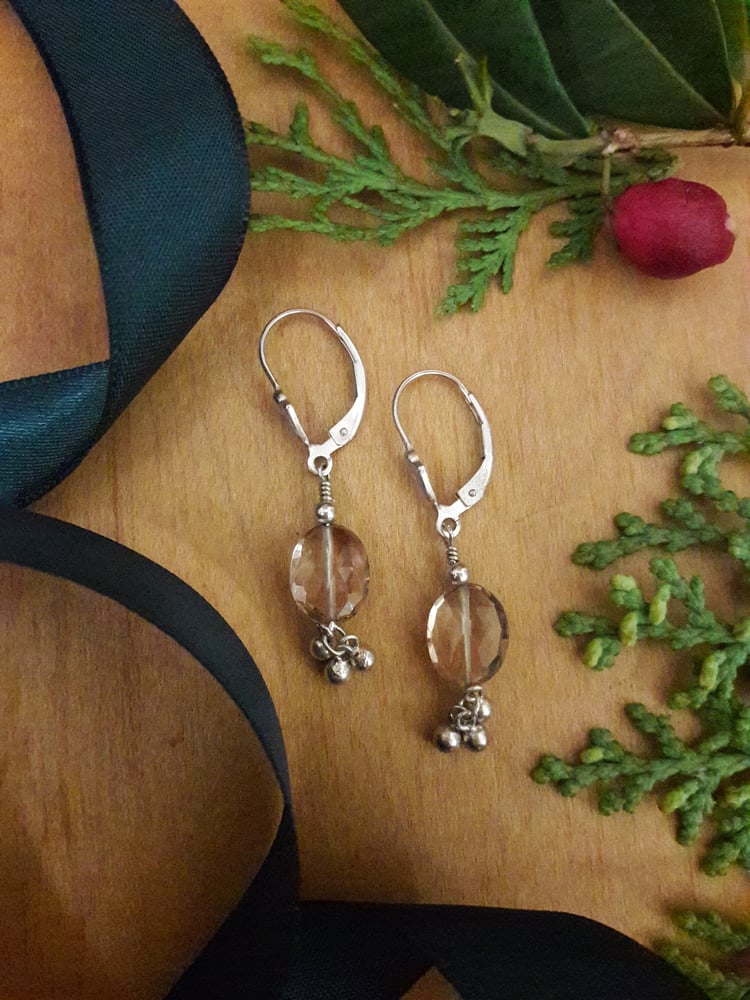 Sterling tulip earrings with champagne quartz faceted ovals, silver dangles at bottom 1-1/2” long.