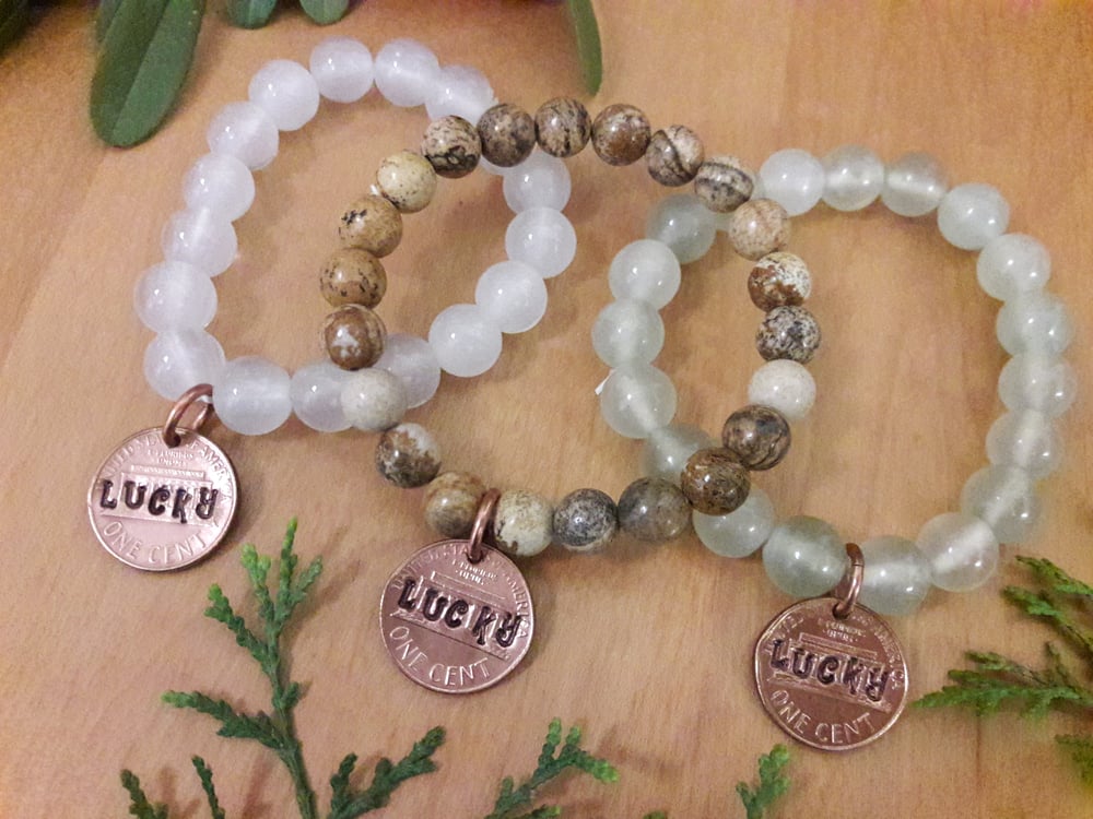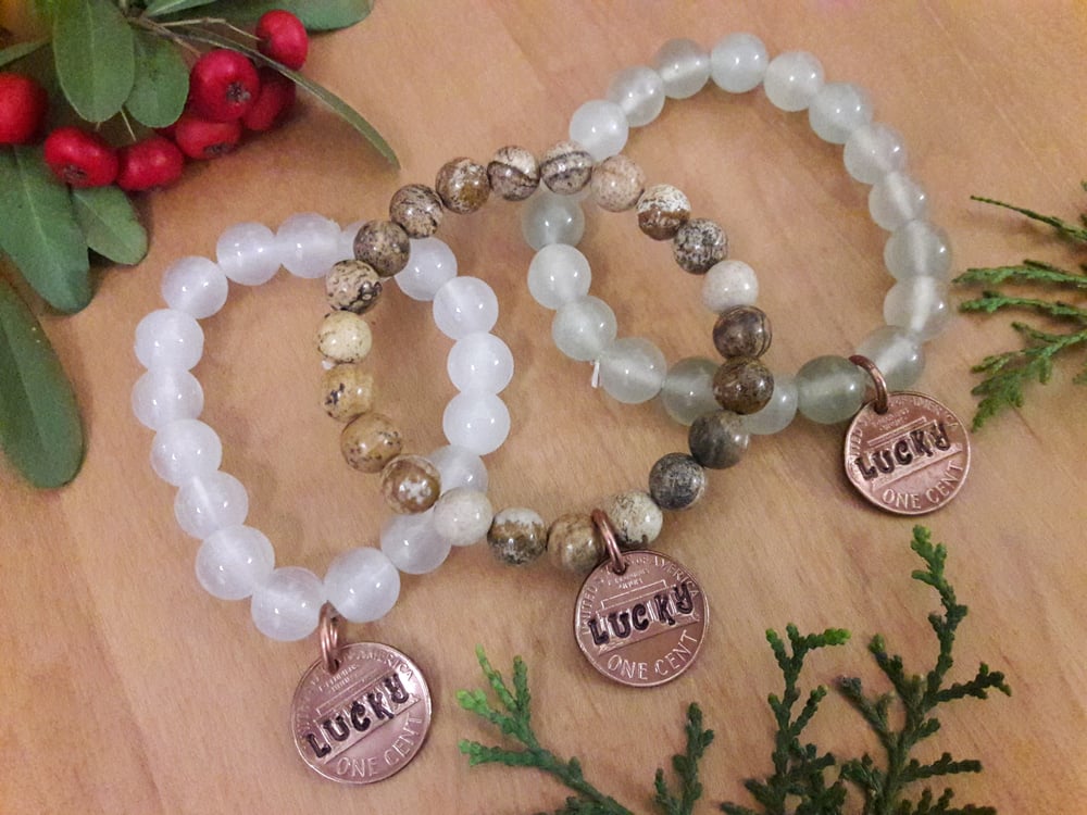 Stretchy agate bracelets, with hand hammered "Lucky" penny attached. Great Stocking Stuffers!