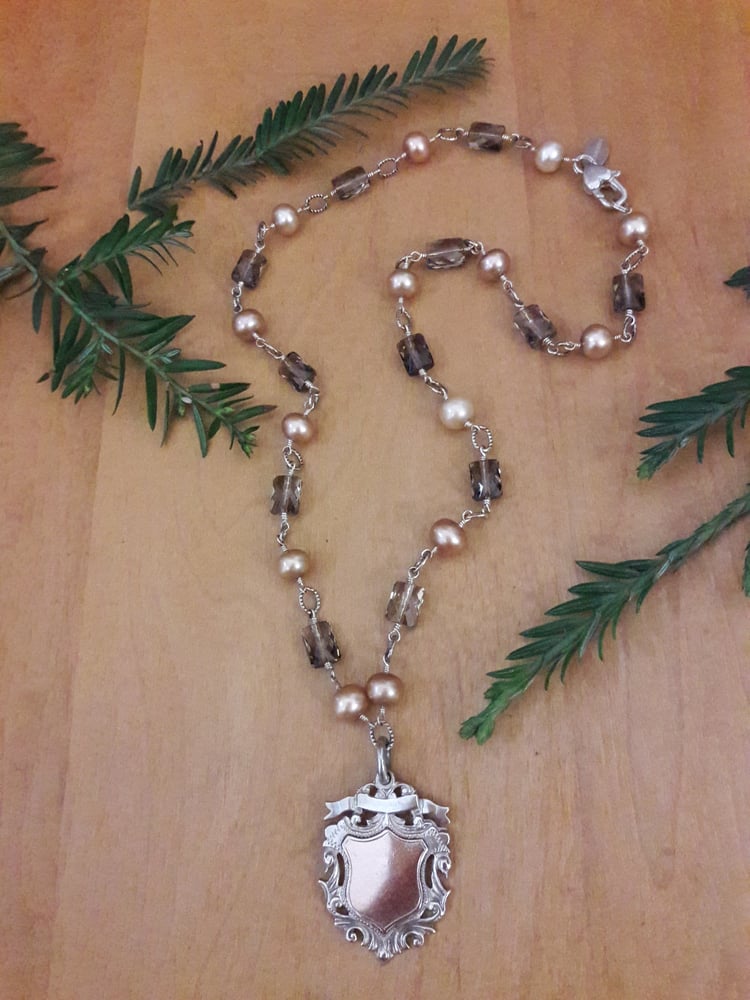 Smoky Topaz fine faceted rectangles and 7mm taupe freshwater pearls with antiqued chain links, fine English shield fob with 9K rose gold accents. Hallmarked 1936. 19-1/4” long.