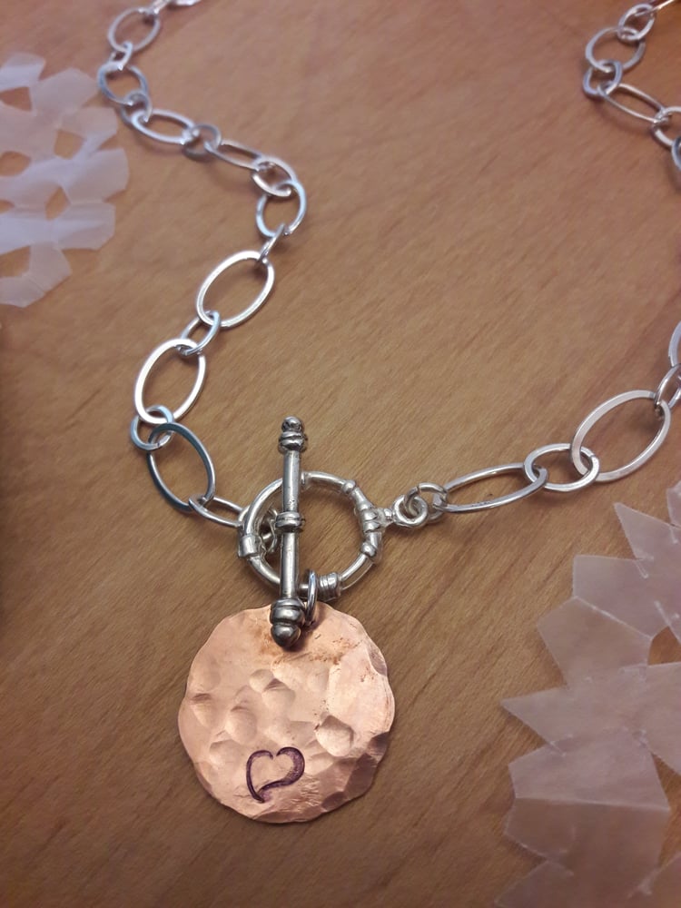Sterling modern oval long and short chain necklace with front toggle clasp. Hand hammered penny pendant with modern heart impression.