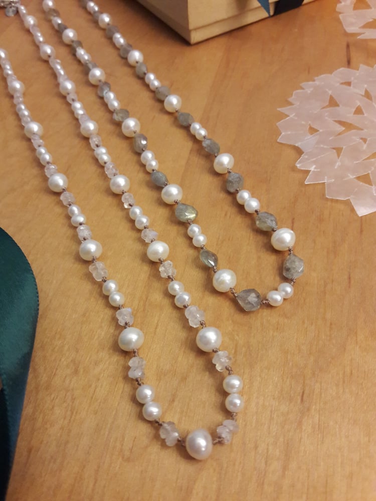 Hand knotted silk necklace with 4mm & 6mm white freshwater pearls, 3XC Rainbow moonstone roundels, 3WZ Labradorite Hearts. Sterling heart clasp. 18-1/4” long. Amazing for that layered look!