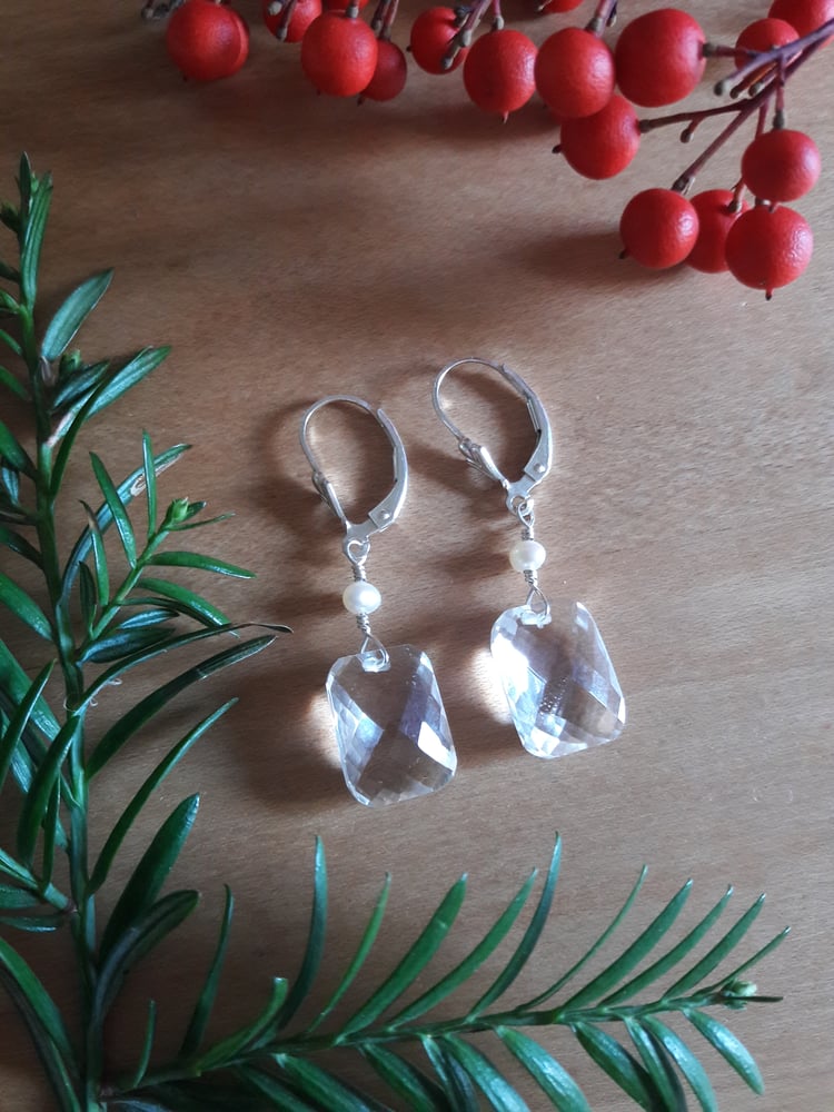 Sterling tulips, sterling chain w/white topaz cushion cut rectangle, dangling from 2mm white pearl. 1-1/2" long.
